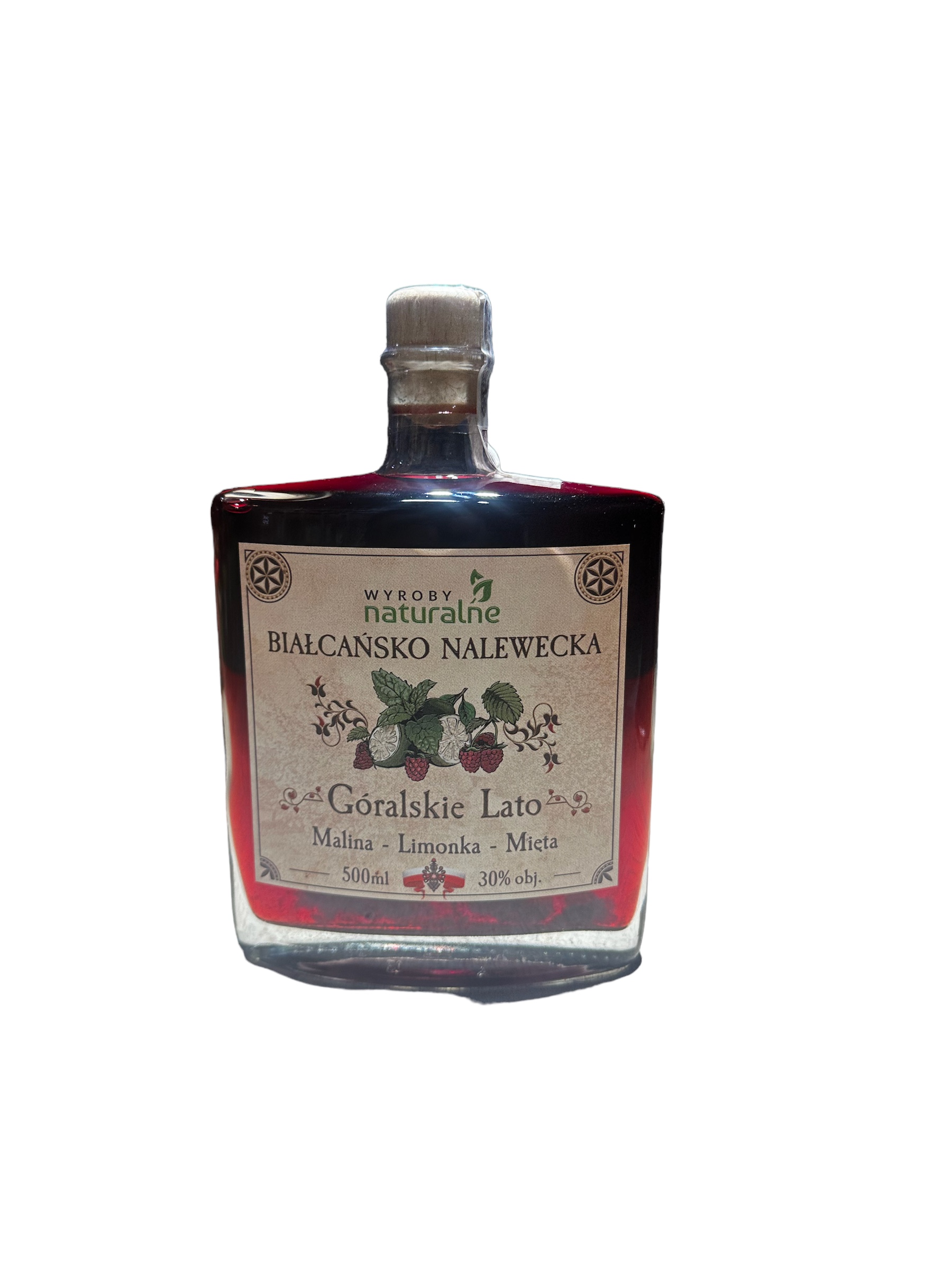 Białcańsko Nalewecka Góralskie Lato 500ml to trzy niezwykle aromatyczne i zdrowe składniki, które w połączeniu tworzą wyjątkowy trunek o intensywnym smaku i zapachu. Maliny to owoc bogaty w witaminy C, K, E oraz błonnik, który wspomaga procesy trawienia i wspiera układ odpornościowy. Limonka natomiast dodaje do nalewki cytrusowej nuty oraz świeży, kwaskowy smak. Mięta z kolei nadaje trunkowi odświeżający i orzeźwiający charakter, oraz wspomaga trawienie.