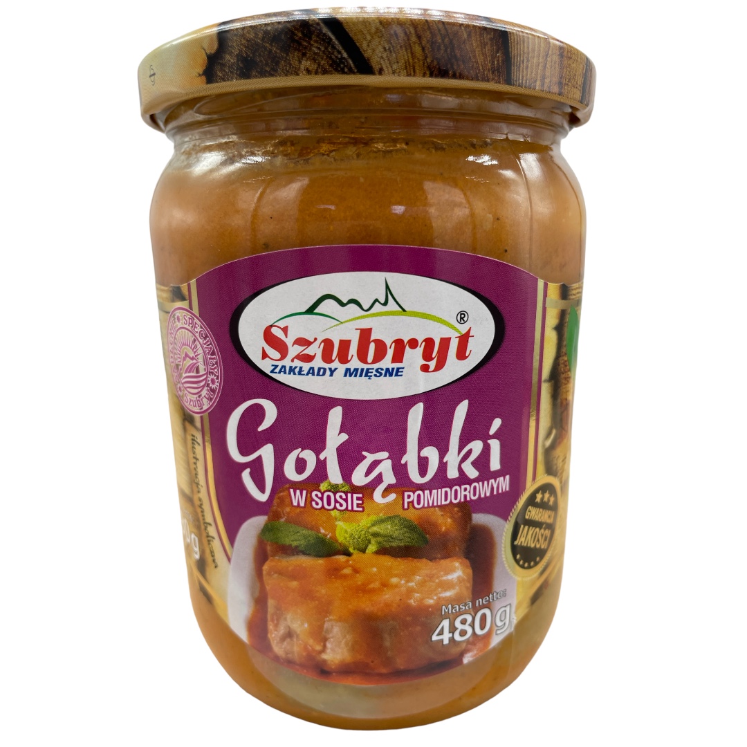 Skład: sos pomidorowy 55% (woda, przecier pomidorowy 6,5%, mąka pszenna 4,5%, śmietana (z mleka) 2,5%, warzywa suszone w zmiennych porcjach (marchew, czosnek, pasternak, cebula, natka pietruszki, por), sól, przyprawy, cukier, glukoza, aromaty (seler)), dwa gołąbki z wieprzowiną i wołowiną min. 45% (kapusta 32%, mięso wieprzowe 24%, mięso wołowe 12%, woda, kasza jęczmienna 8%, cebula smażona 6%, tłuszcz wieprzowy, ryż biały 4%, sól, przyprawy). Produkt może zawierać: jaja, soję, gorczycę.