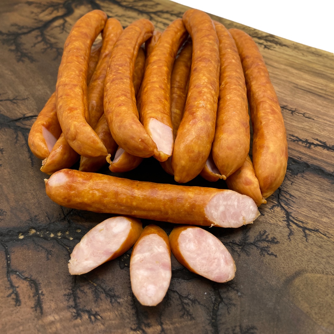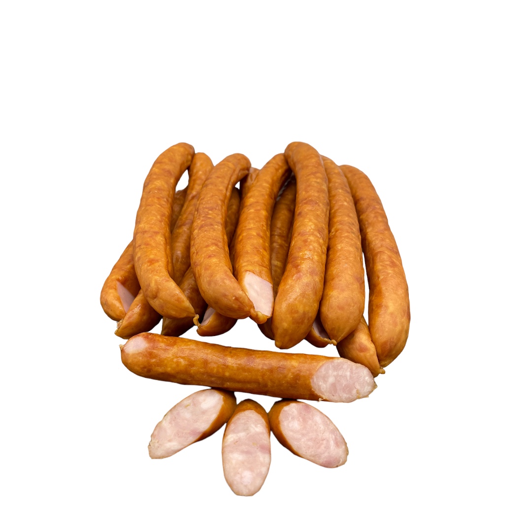 Kiełbaski Wyborne to produkt średnio rozdrobiony wieprzowy parzony i wędzony.
