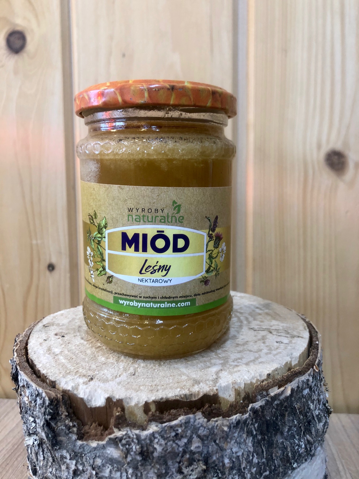 Miód leśny, wbrew obiegowej opinii, nie musi wcale zawierać spadzi. Jest ona co prawda częstym składnikiem tej odmiany miodu, jednak nie jedynym jego elementem. Miód leśny jest pozyskiwany z roślin rosnących "na dziko" w lesie. To oznacza, że w jego składzie mogą znajdować się różne, miododajne rośliny, które rosną na danym terenie - takie jak jeżyny, maliny, borówka brusznica, lipa i wiele innych. Dokładna zawartość miodu leśnego jest uzależniona od struktury leśnej roślinności na danym terenie. Z reguły charakteryzuje się on dość intensywnym, lekko leśnym zapachem, a w smaku jest słodkawy, z delikatną, ziołową nutą.