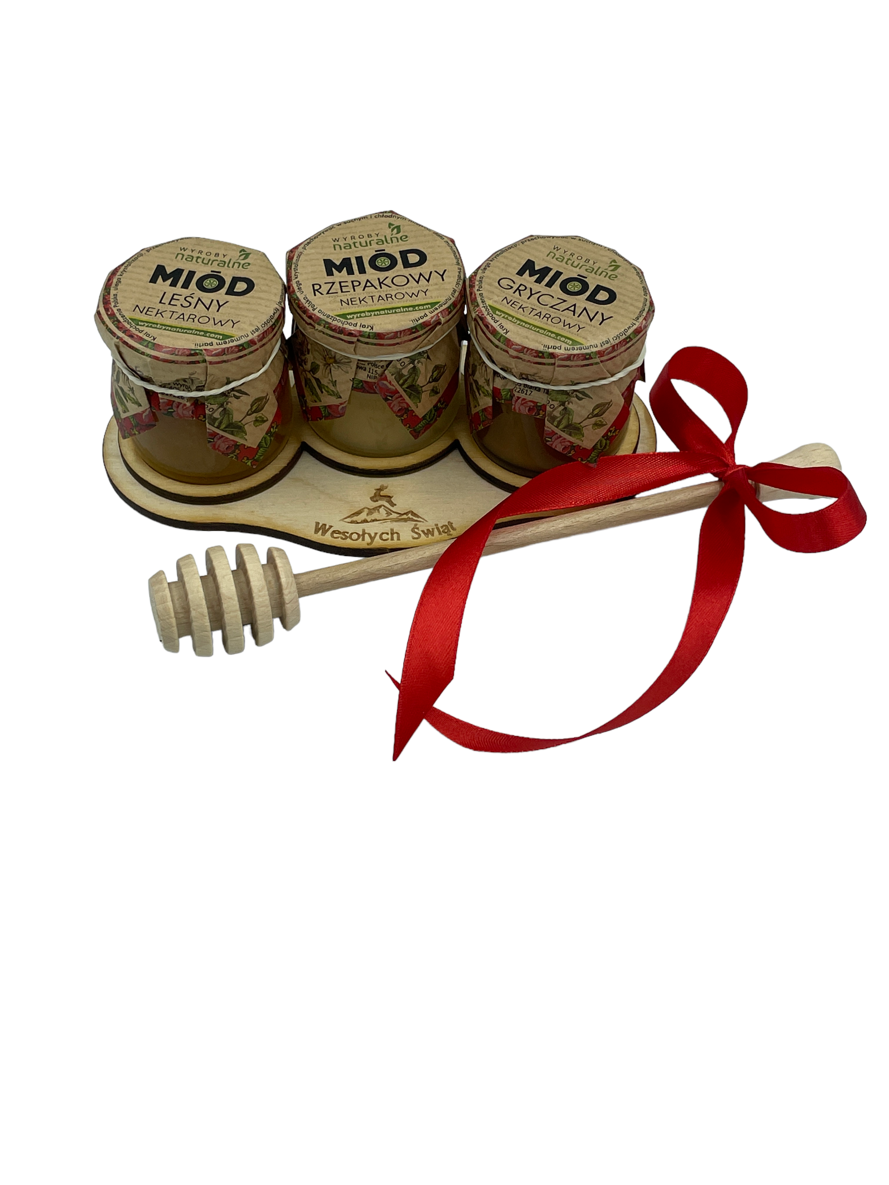 • Zestaw 3 miodków na podstawce świątecznej  z łyżką do miodu zapakwany w celafon. Idealny na prezent.