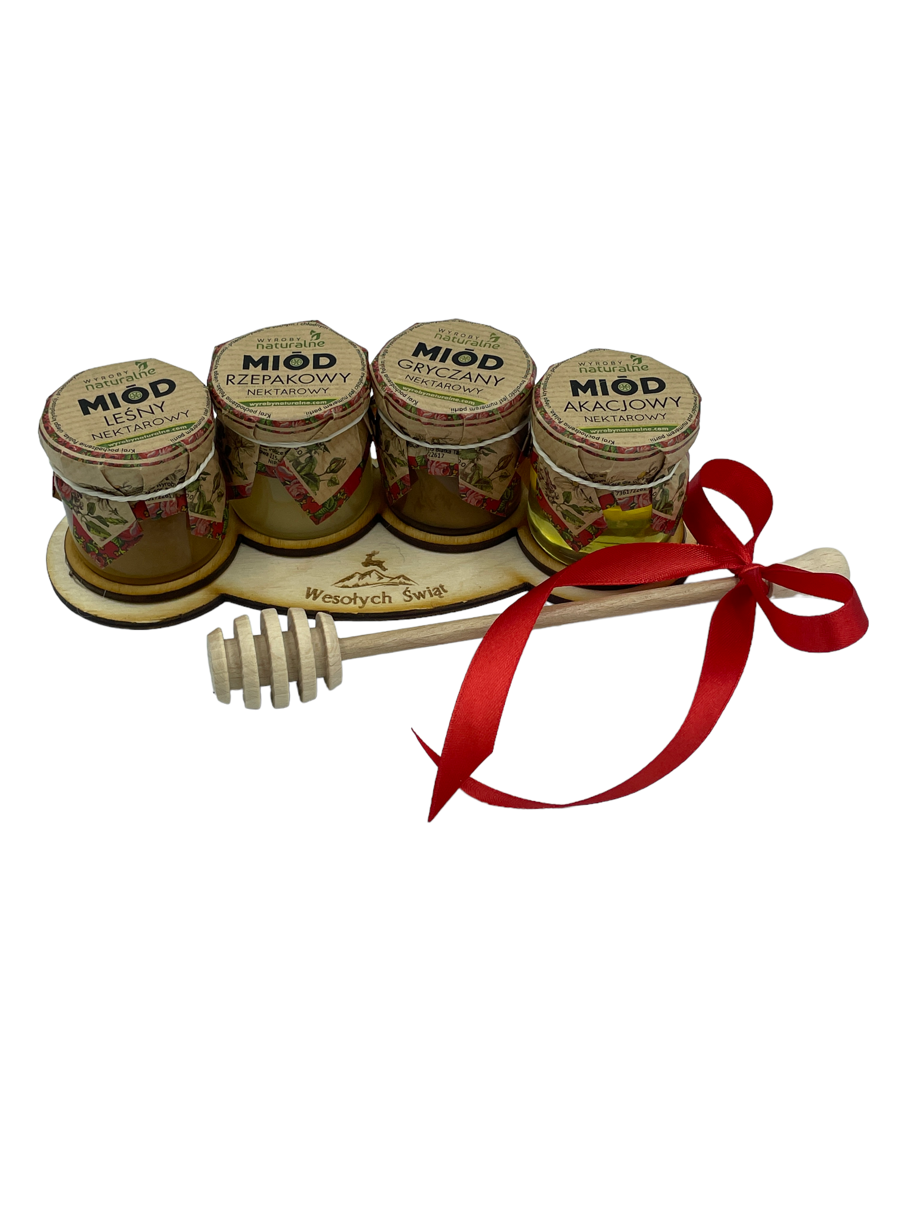 • Zestaw 4 miodków na podstawce świątecznej z łyżką do miodu. Zapakowane w ozdobny celafon, przewiązany czerwoną kokardką.