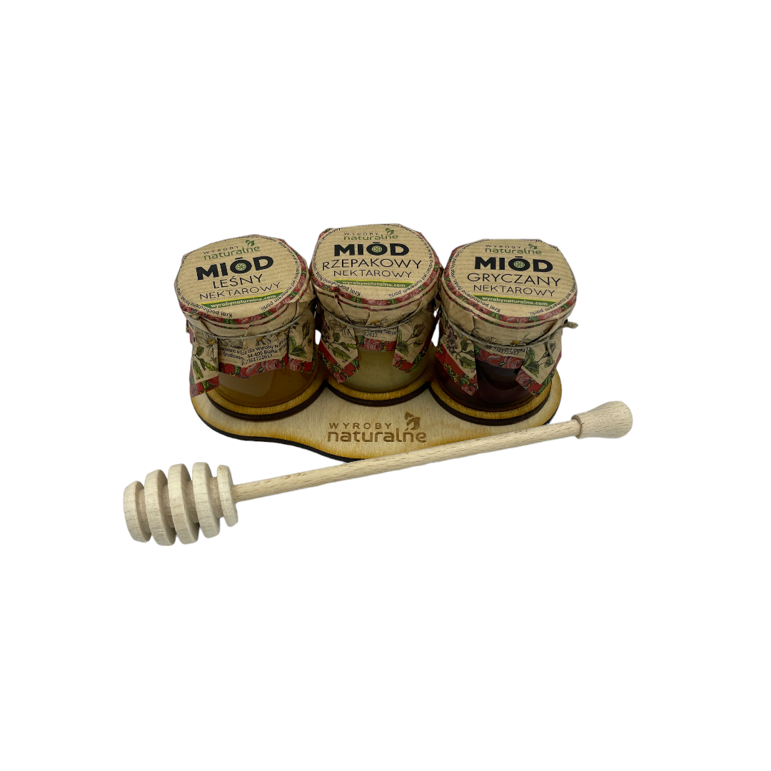 • Zestaw 3 miodków na podstawce z łyżką do miodu zapakwany w celafon. Idealny na prezent.