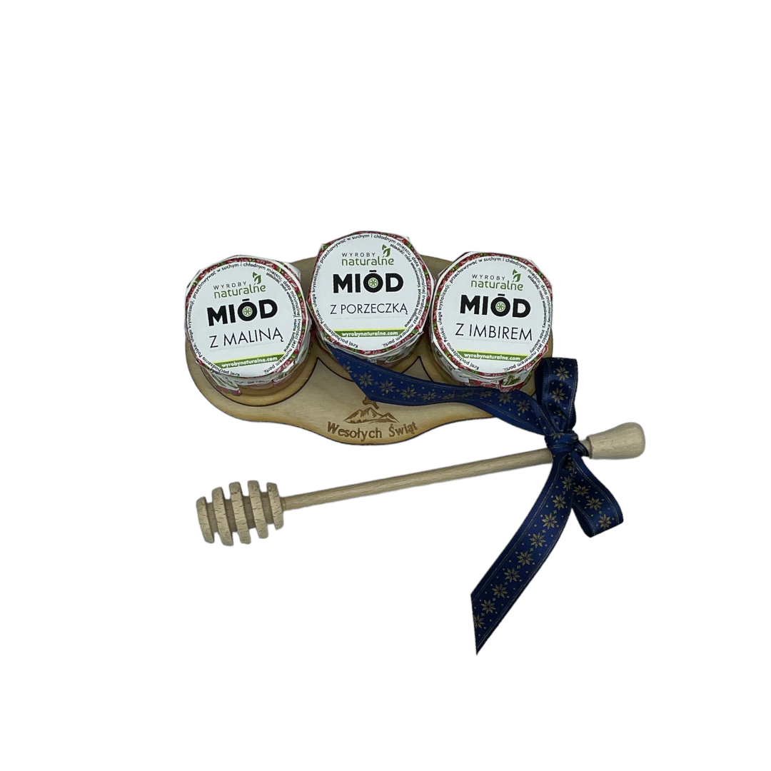 Zestaw 3 miodków smakowych na świątecznej podstawce z łyżką