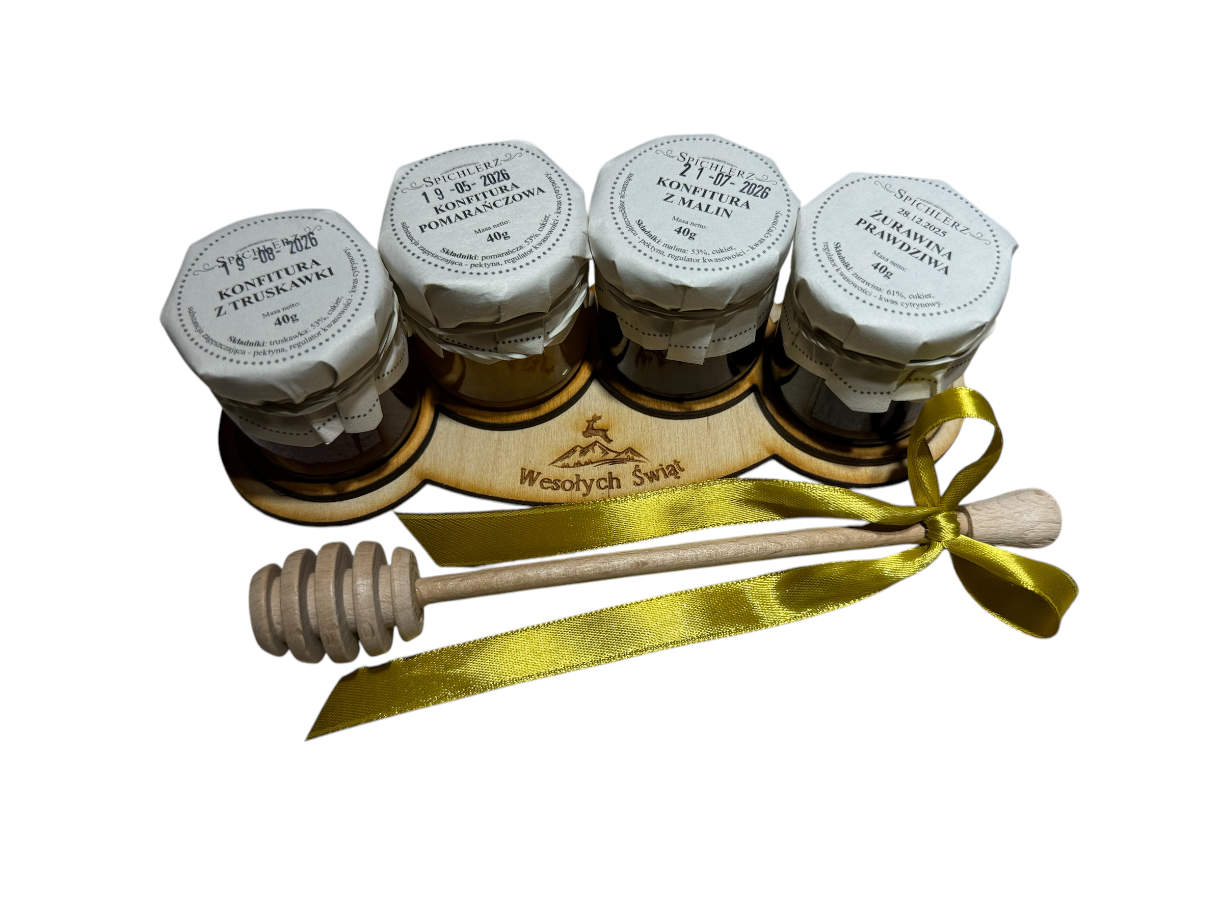 • Zestaw czterech konfitur na podstawce świątecznej  z łyżką do miodu zapakwany w celafon. Idealny na prezent.
