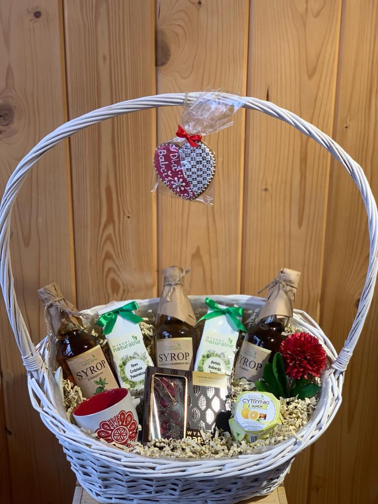 Syrop z pokrzywy, yrop z imbiru, syrop z kwiatu czarnego bzu, kawa czekolada pomarańcza, herbata królewska jagoda, czekolada ciemna z prazonym ziarnem kakaowca i wiśniami, cyrtrynki z rumem, kubek z łyżeczką, pierniczek ozdobny. Wszystko to zapakowane w eleganckim koszu.