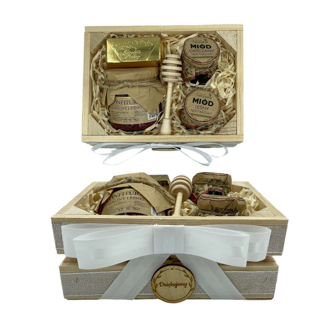 Całość zapakowana w stylowej, drewnianej skrzynce z kokardką, z napisem "Dziękujemy"