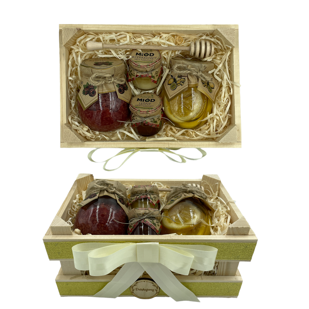 Całość zapakowana w stylowej, drewnianej skrzynce z kokardką, z napisem "Dziękujemy"