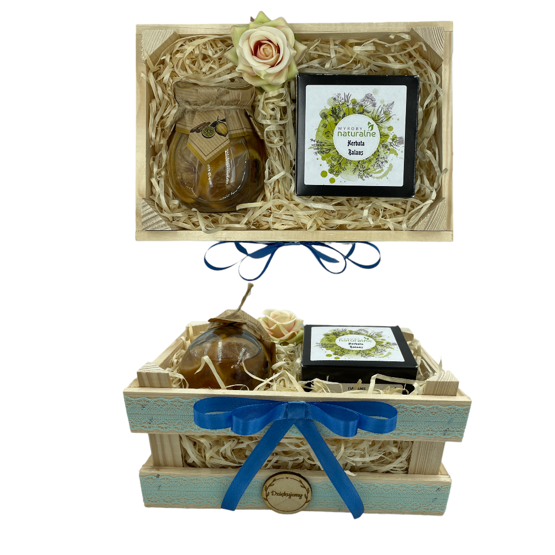 Całość zapakowana w stylowej, drewnianej skrzynce z kokardką, z napisem "Dziękujemy"