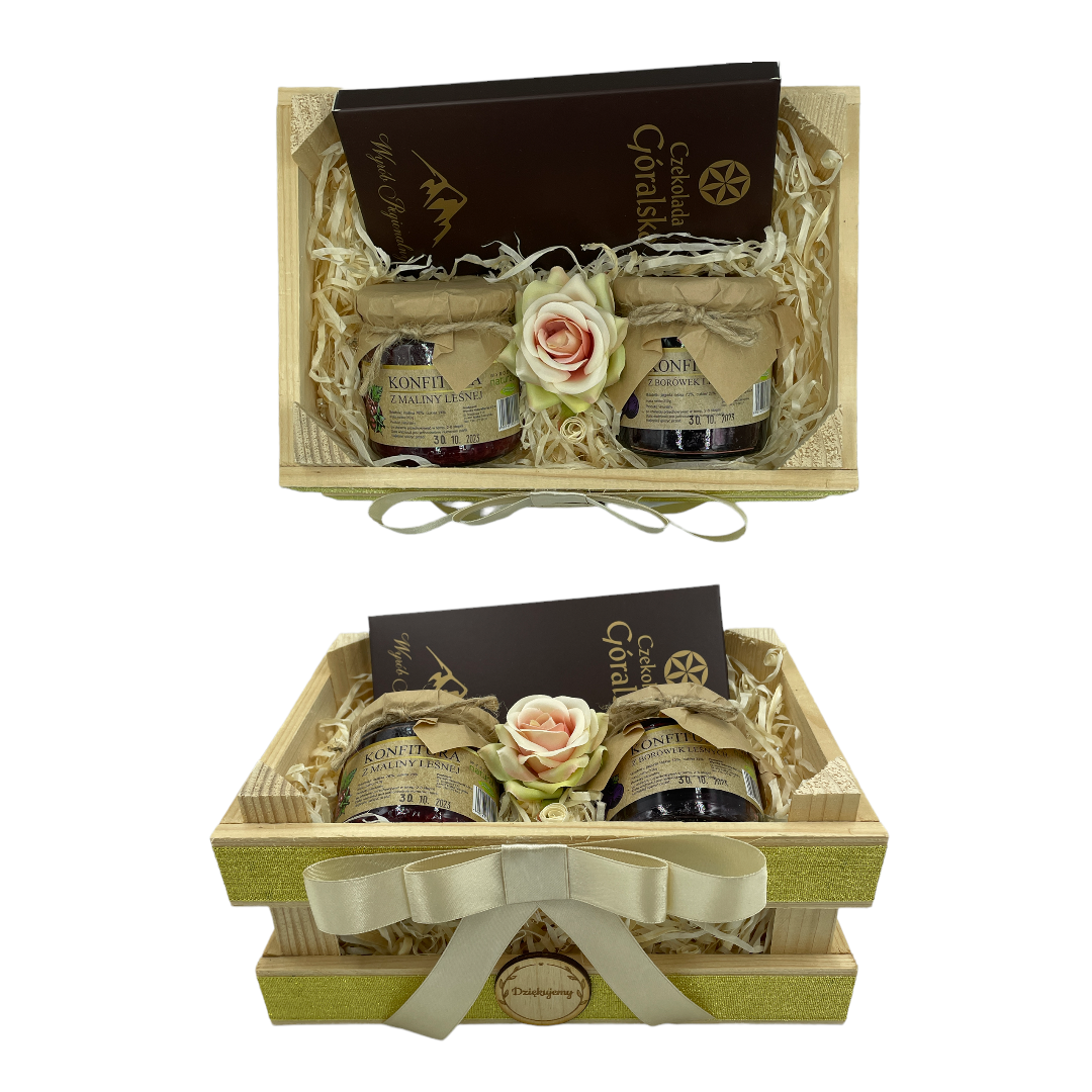 Całość zapakowana w stylowej, drewnianej skrzynce z kokardką, z napisem "Dziękujemy"