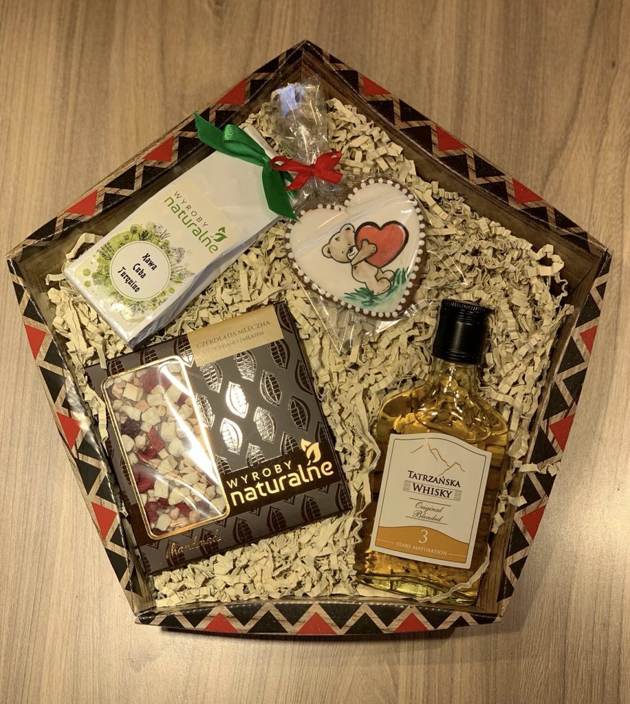 Czekolada mleczna z wiśniami i jabłkiem, Tatrzańska Whisky 200ml, kawa Cuba Turquino oraz ozdobny pierniczek. Wszytko to zapakowane w eleganckim pudełku.