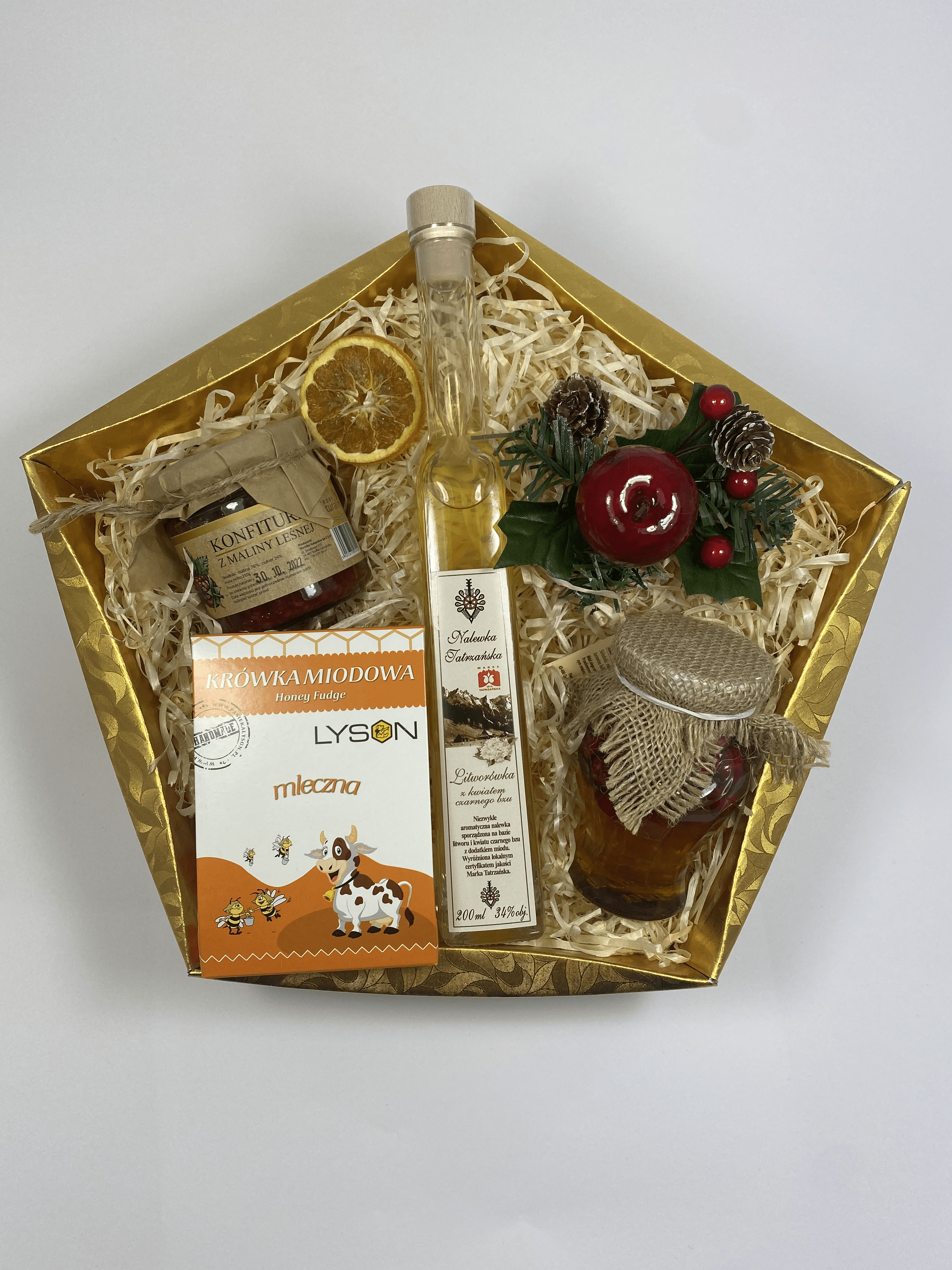 • pudełko + wypełnienie+ ozdoby, folia celofanowa+ wstążka