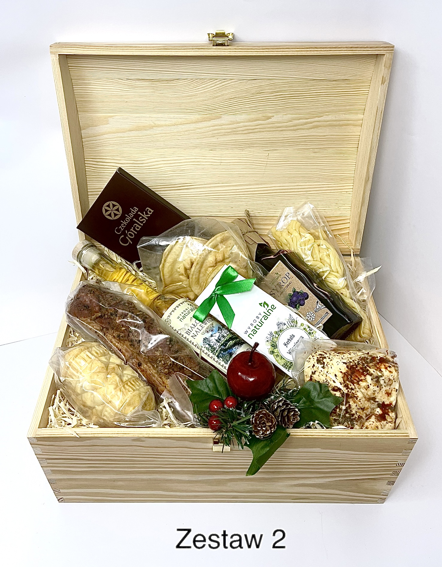 • Skrzynia drewniana, wypełnienie, dodatki, ozdobna wstążka