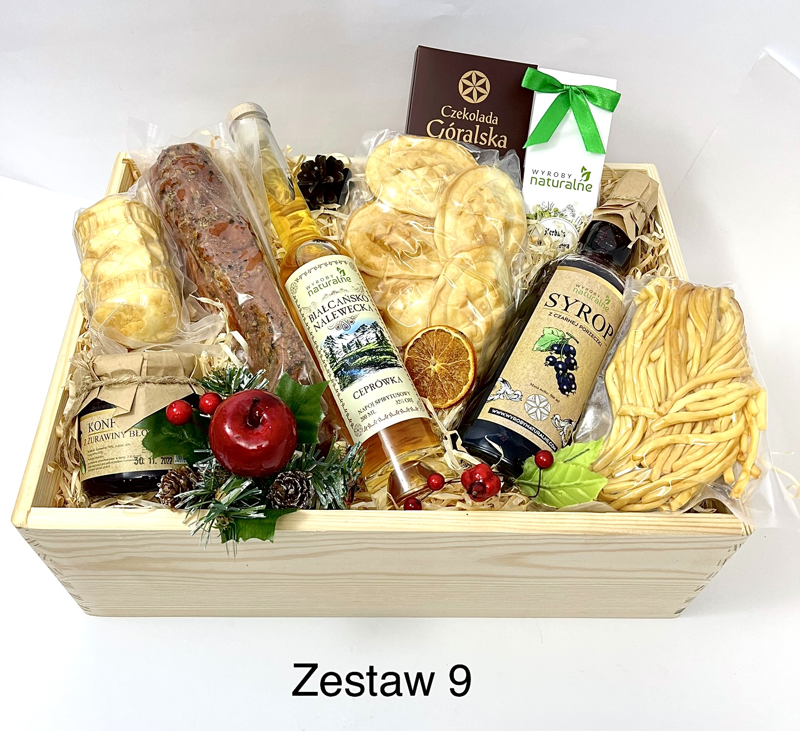 • Skrzynka Drewniana, wypełnienie, dodatki, folia celofanowa, wstążka