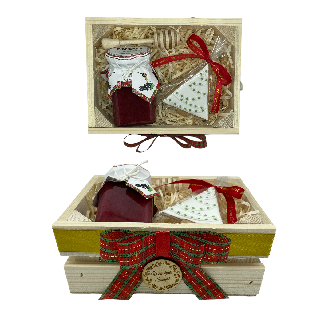 Całość zapakowana w drewnianą zdobioną skrzynkę, z wypełnienie, zawinięte w folię celofanową.