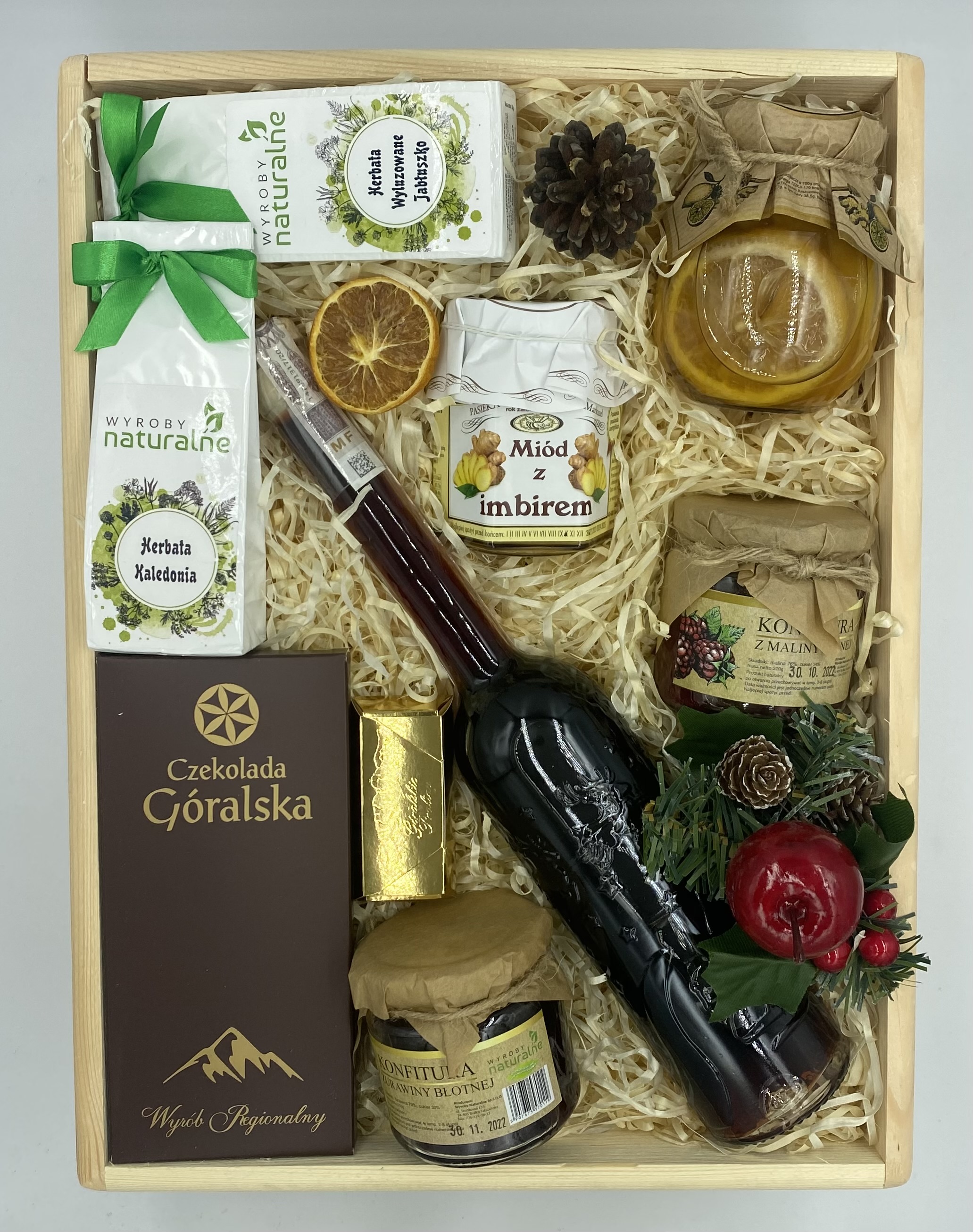 Nalewka Góralska Wisniowa 350 ml w świątecznej butelce, czekolada góralska ( mix smaków), herbata owocowa 50 g (mix smaków), herbata czarna z owocami 50 g, miód z imbirem 230g, cytrynki z rumem, konfitura z maliny leśnej 210g, konfitura z żurawiny błotnej 210g, pralina góralska, skrzynka drewniana+ wypełnienie+ozdoby+folia celofanowa+wstążka
