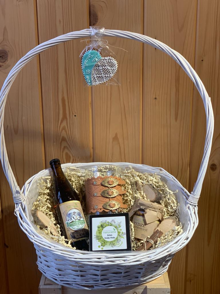 Piwo Czerwone wierchy pszeniczne, Kufel góralski w ozdobnym pasie, herbata dziadka Władka, rydze marynowaneoraz ozdobny pierniczek. Wszytko to zapakowane w eleganckim koszu.