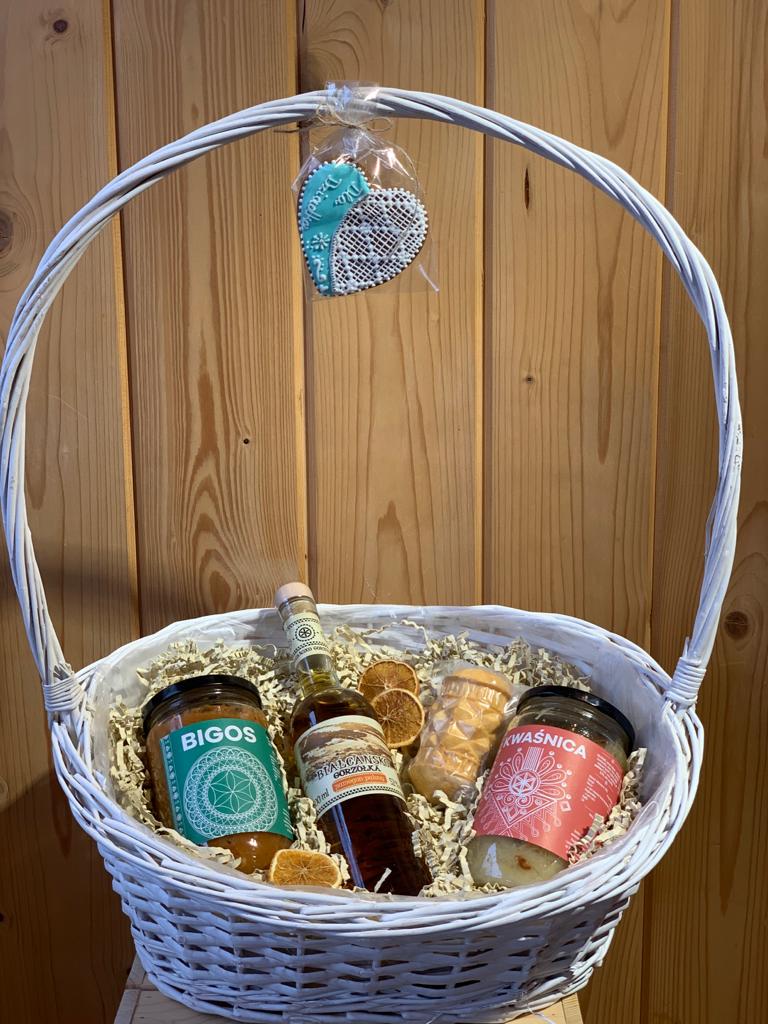 Białcańsko Gorzołka Samogon Palony, Bigos, Kwaśnica Góralska, Gałka tradycyjna owcza oraz pierniczek ozdobny . Wszytko to zapakowane w eleganckim koszyku.