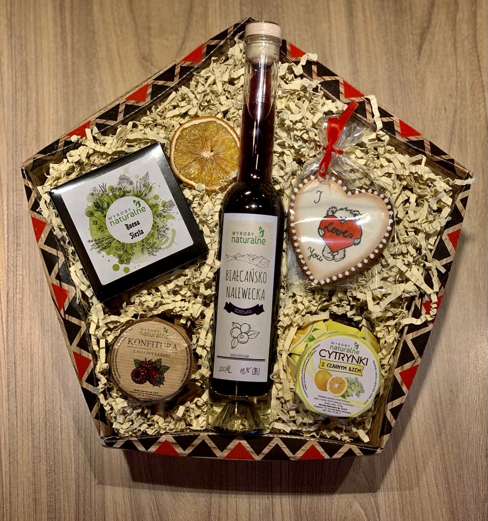 Konfitura z maliny leśnej, cytrynki z czarnym bzem, herbata buena siesta, białcańsko nalewecka borówkowa oraz ozdobny pierniczek. Wszytko to zapakowane w eleganckim pudełku.