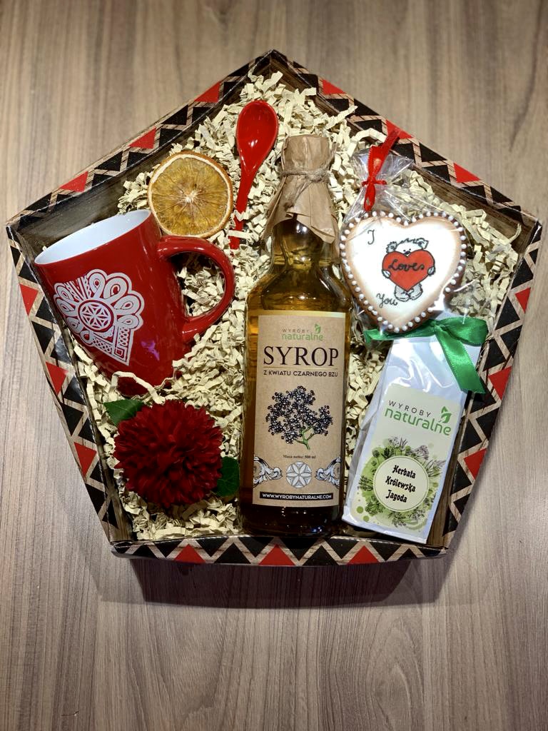 Kubek, Syrop z kwiatu czarnego bzu, herbata królewska jagoda oraz ozdobny pierniczek. Wszytko to zapakowane w eleganckim pudełku.