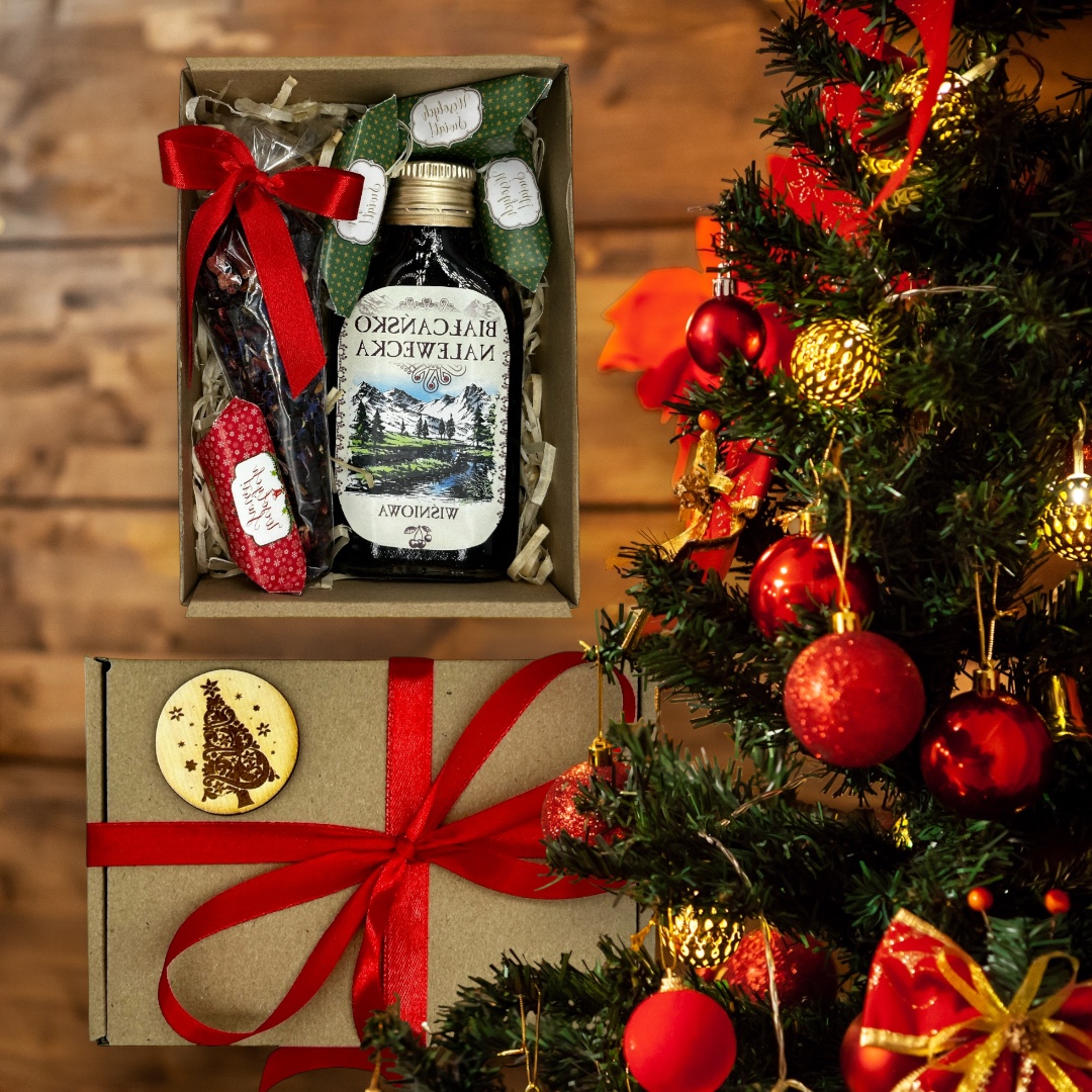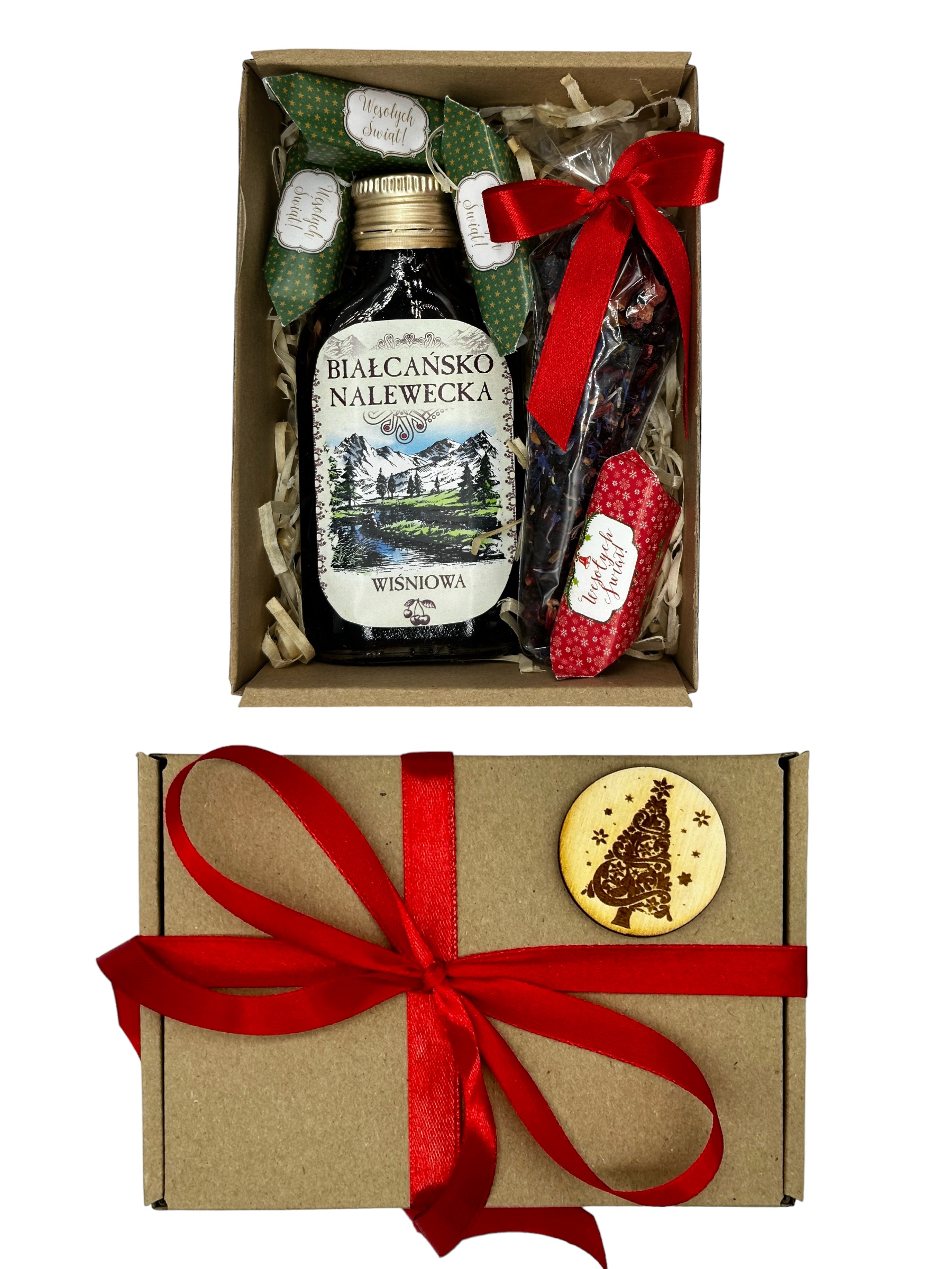 Całość zapakowana w kartonik, z wypełnieniem, przewiązane ozdobną wstążką.