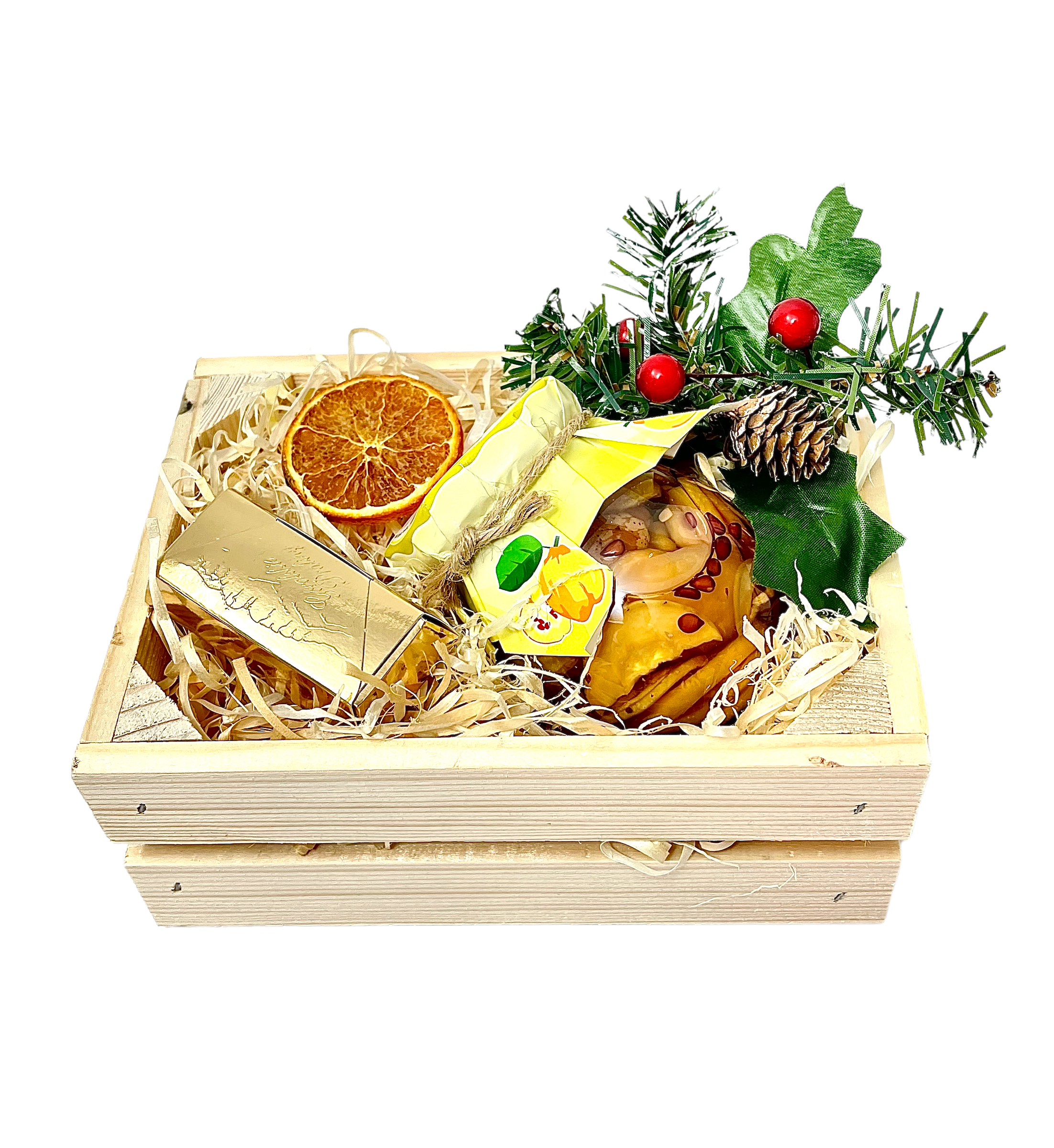 • Skrzynka drewniana, wypełnienie, ozdoby, celafon, wstążka