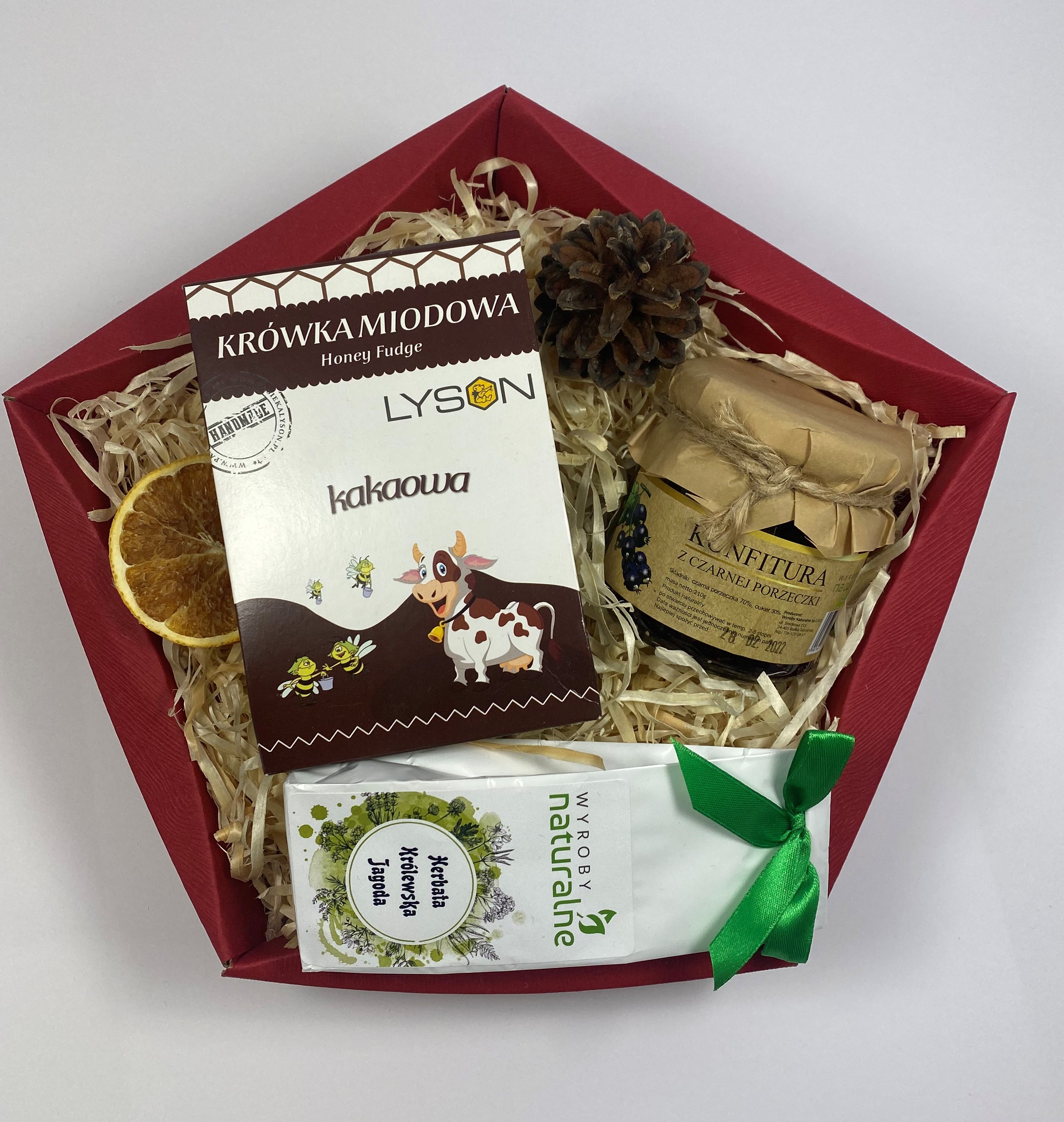 • Konfitura z żurawiny błotnej 210g, Herbata owocowa 50g, Krówka Kakaowa 120g,
