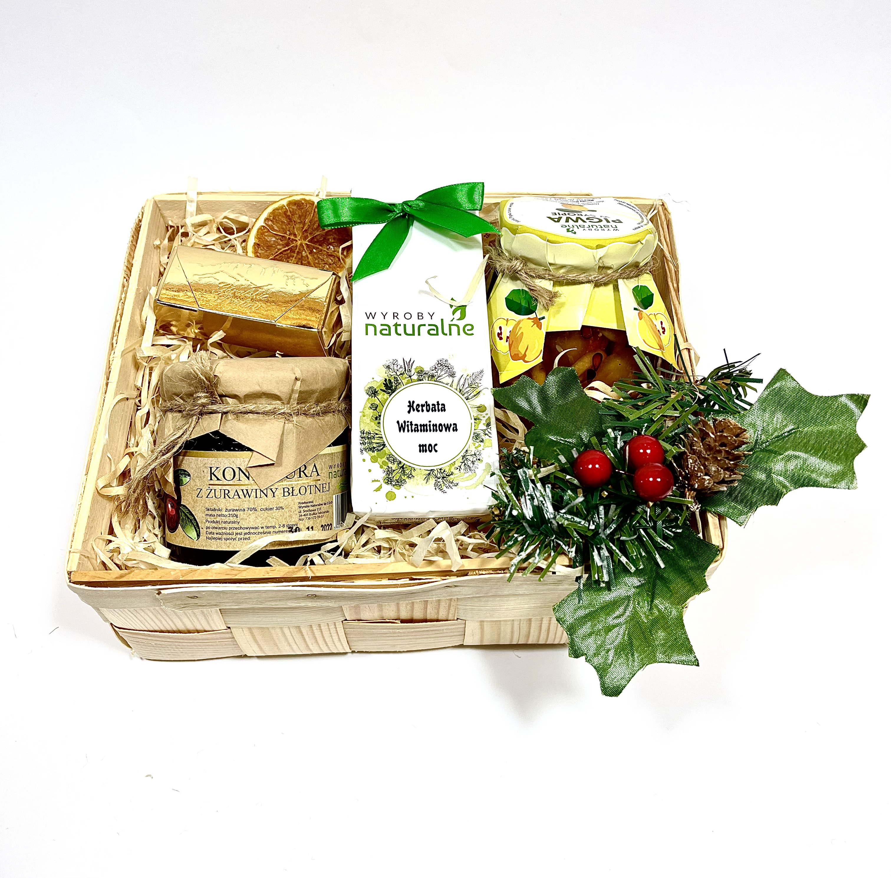 • Kosz z łuby sosnowej + wypełnienie+ ozdoby, folia celofanowa+ wstążka