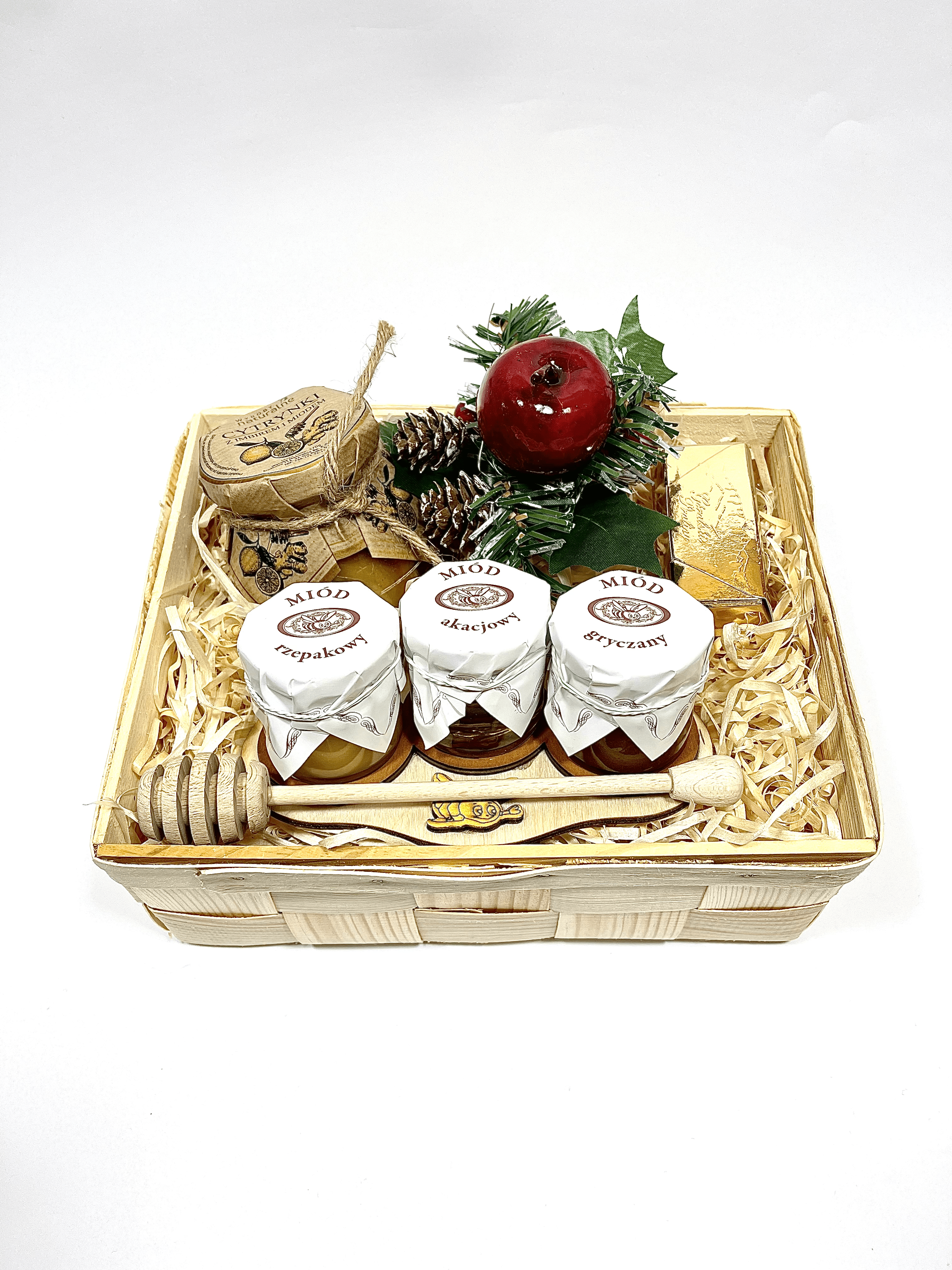 • Kosz z łuby sosnowej + wypełnienie+ ozdoby, folia celofanowa+ wstążka