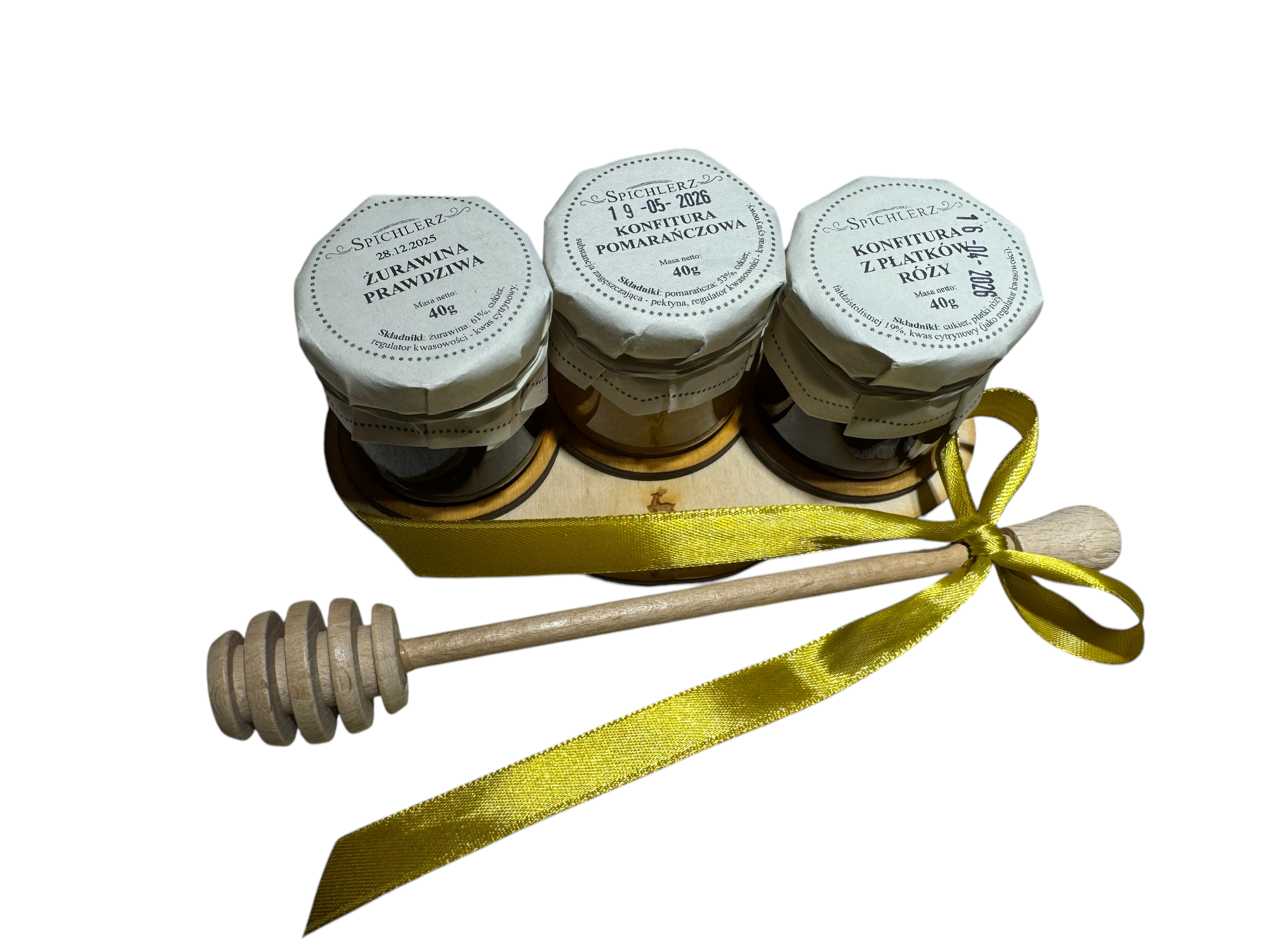 • Zestaw trzech konfitur na podstawce świątecznej  z łyżką do miodu zapakwany w celafon. Idealny na prezent.