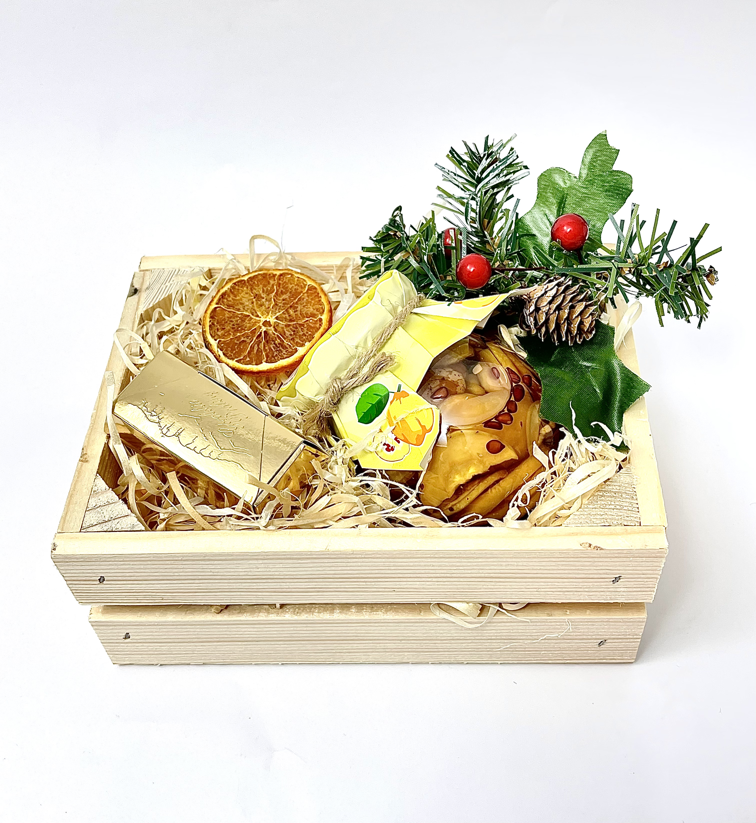 Skrzynka drewniana, wypełnienie, ozdoby, celafon, wstążka