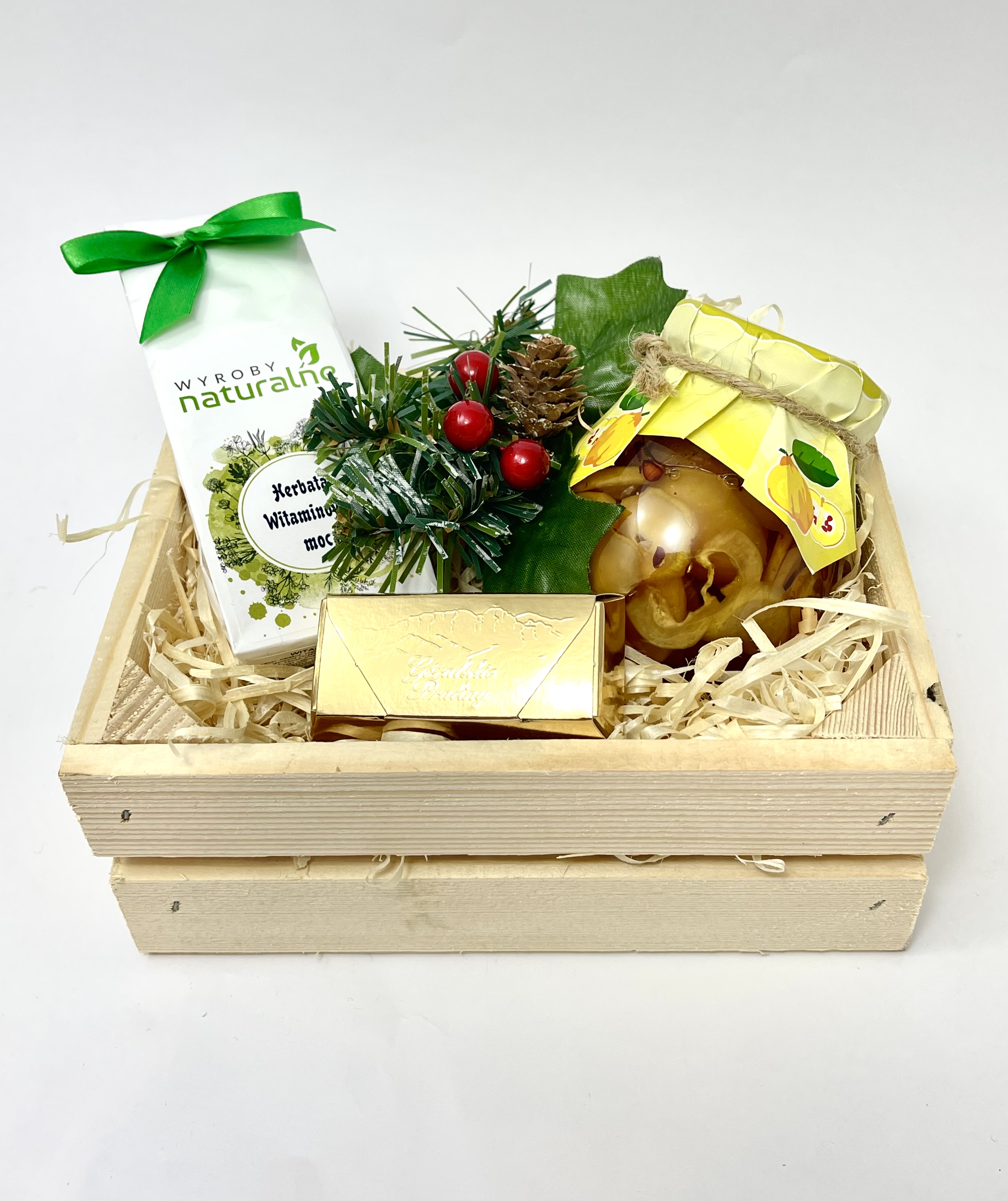 Skrzynka drewniana, wypełnienie, ozdoby, celafon, wstążka