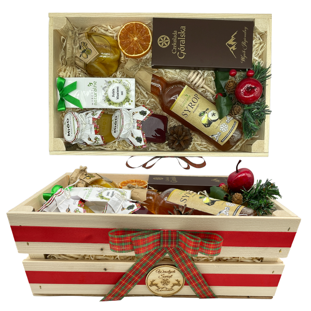 Całość zapakowana w drewnianą zdobioną skrzynkę, z wypełnienie, zawinięte w folię celofanową.