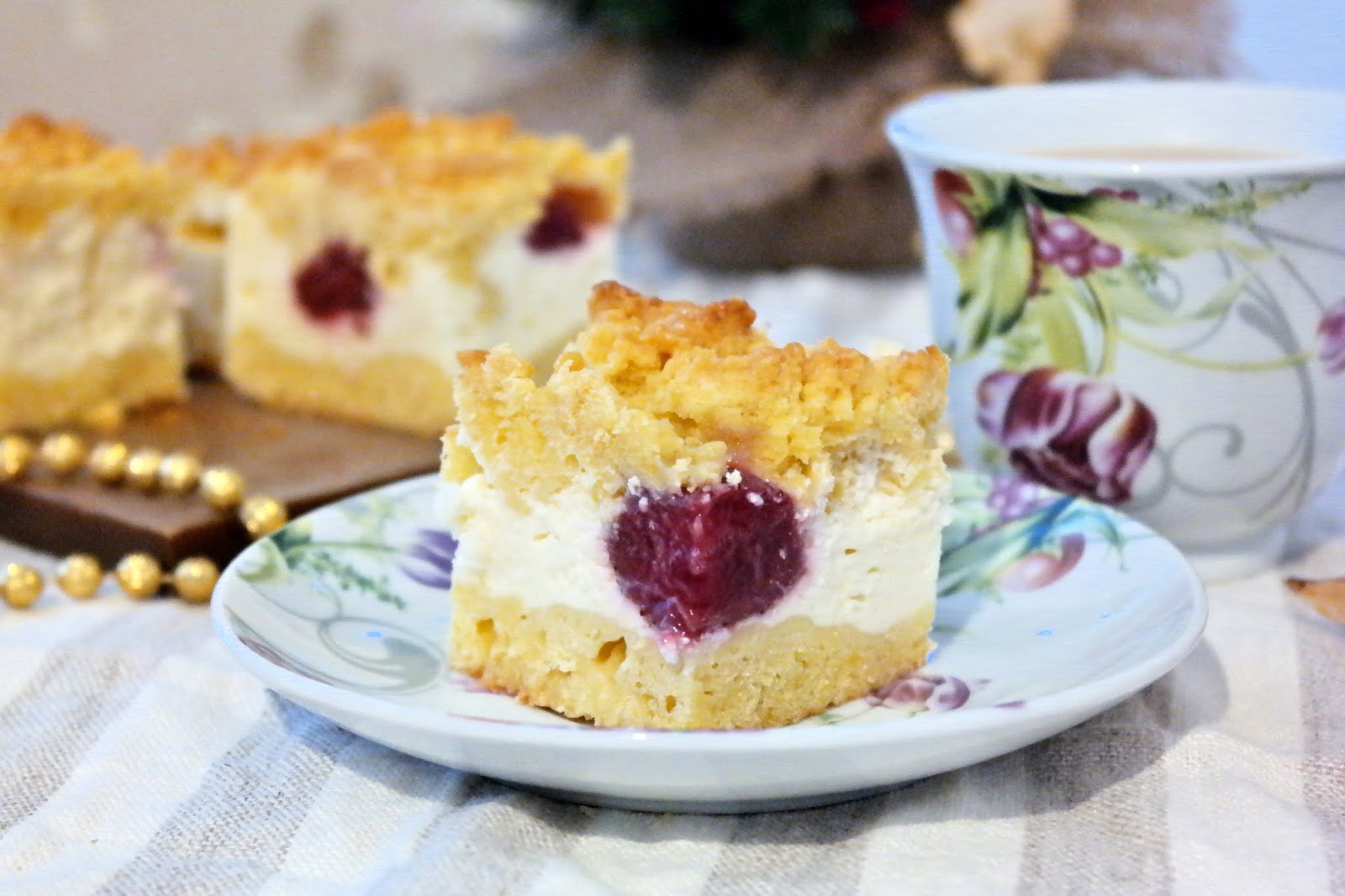Na masę jogurtową wykładamy owoce i posypujemy startym kruchym ciastem.